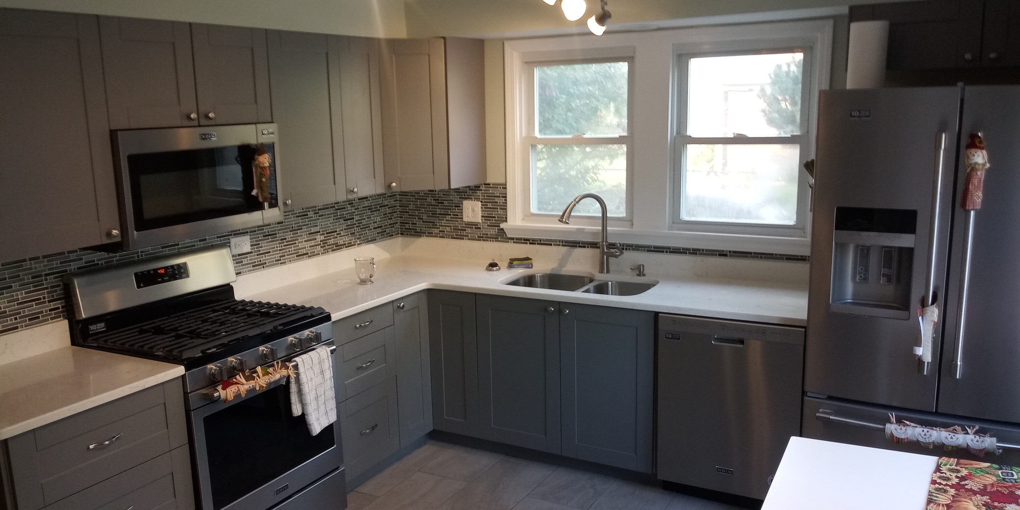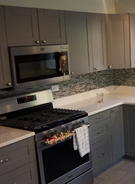 Cabinet, countertop, and appliance installation.